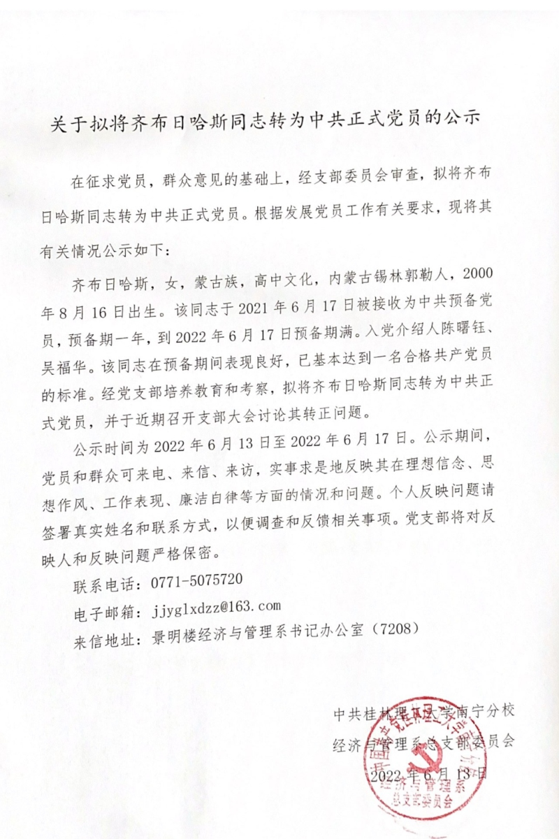 关于拟将齐布日哈斯同志转为中共正式党员的公示
