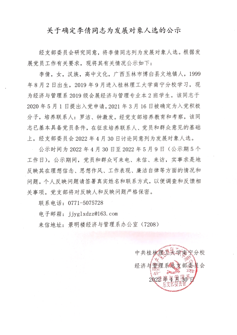 关于确定李倩同志为发展对象人选的公示