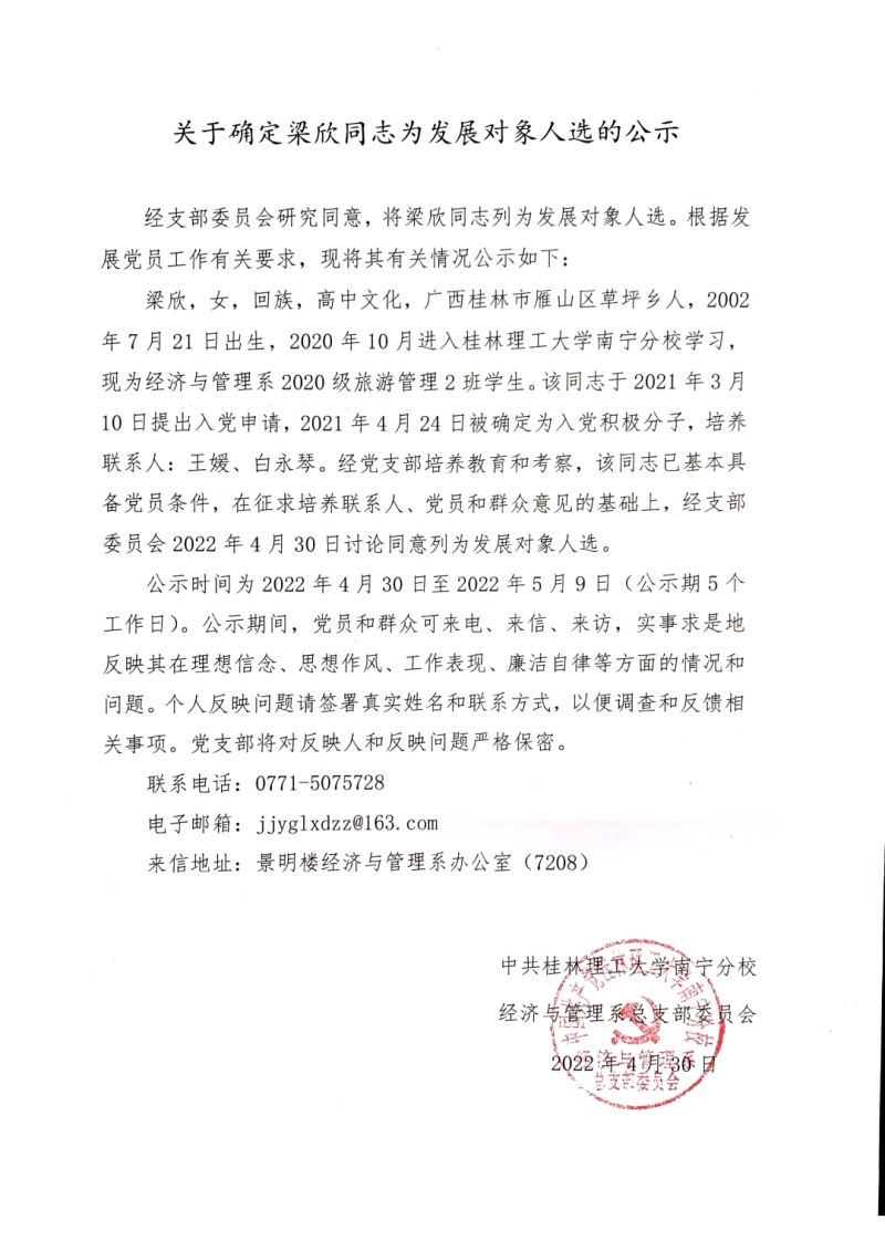 关于确定梁欣同志为发展对象人选的公示