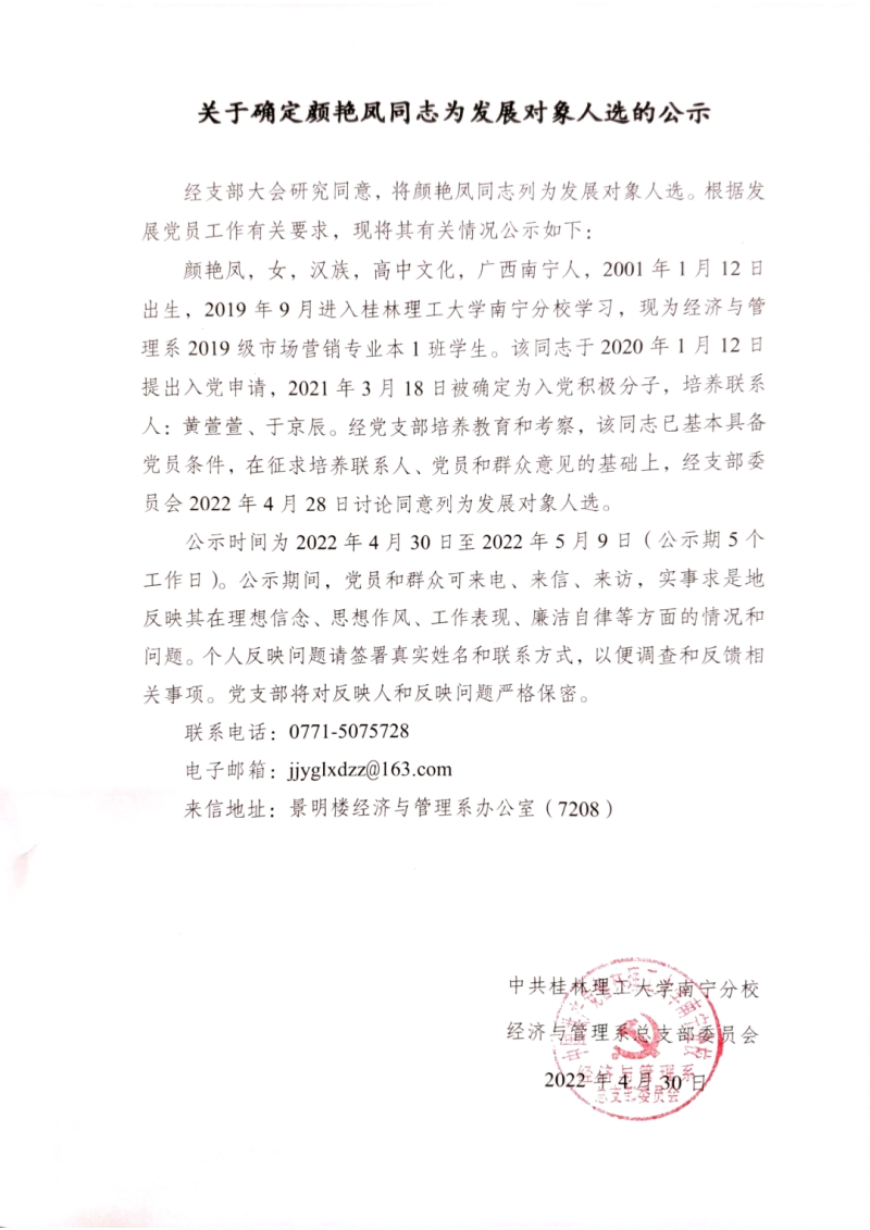 关于确定颜艳凤同志为发展对象人选的公示