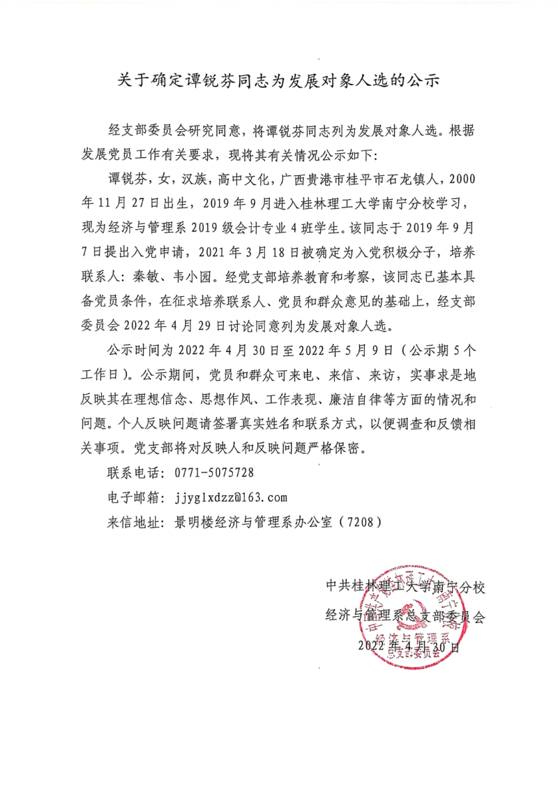 关于确定谭锐芬同志为发展对象人选的公示