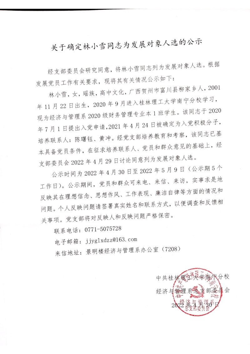 关于确定林小雪同志为发展对象人选的公示