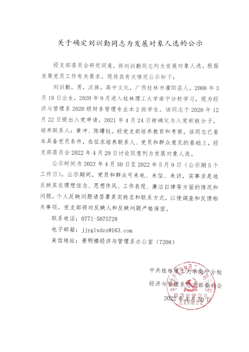 关于确定刘训勤同志为发展对象人选的公示