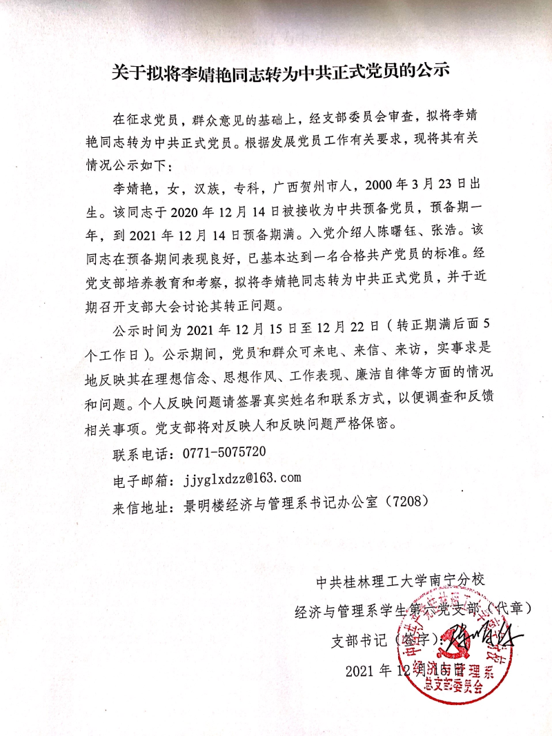关于拟将李婧艳同志转为中共正式党员的公示