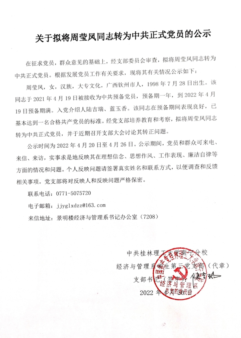 关于拟将周莹凤同志转为中共正式党员的公示