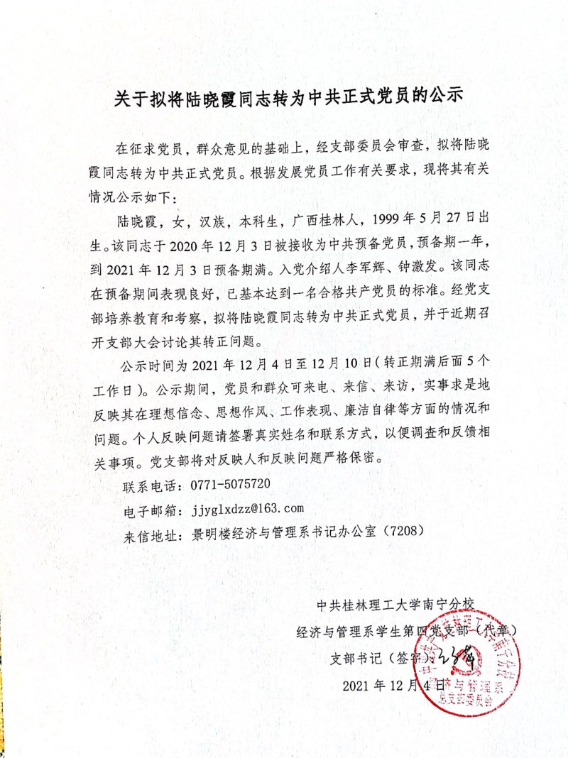关于拟将陆晓霞同志转为中共正式党员的公示