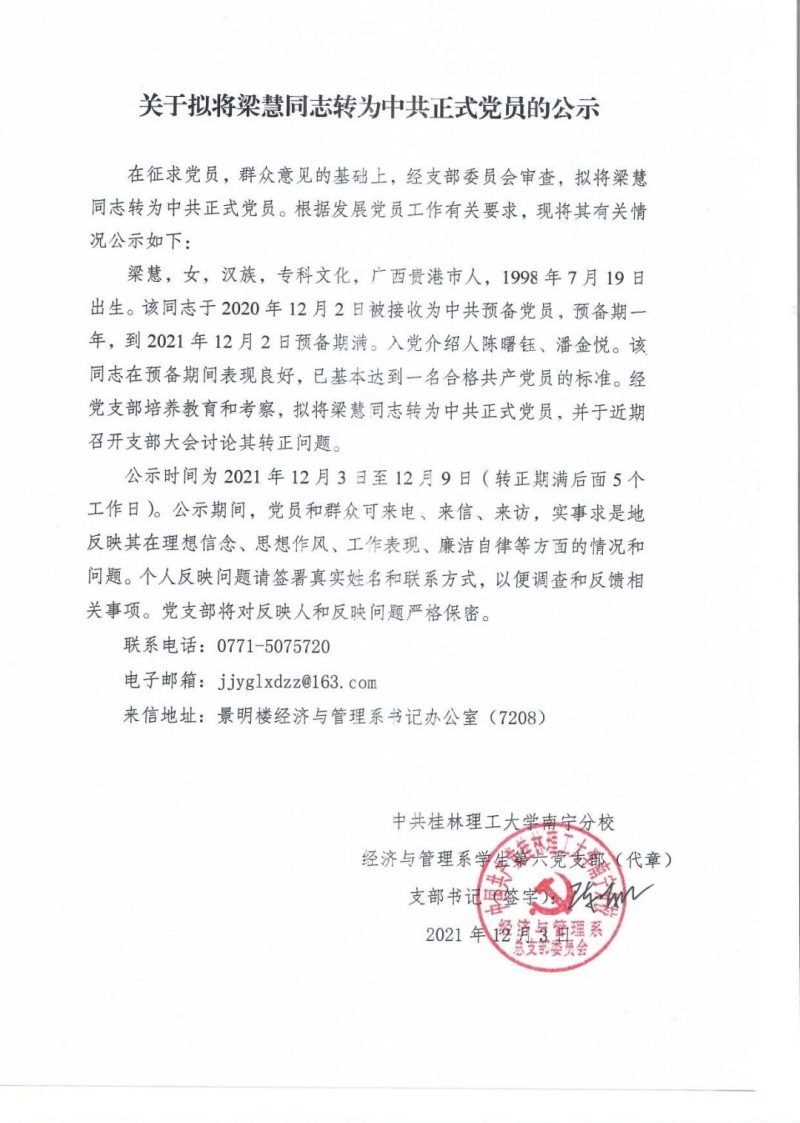 关于拟将梁慧同志转为中共正式党员的公示