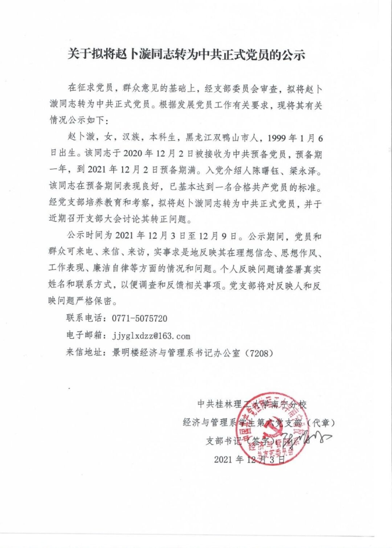 关于拟将赵卜漩同志转为中共正式党员的公示