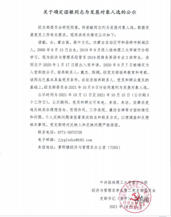 关于确定诺敏同志为发展对象人选的公示