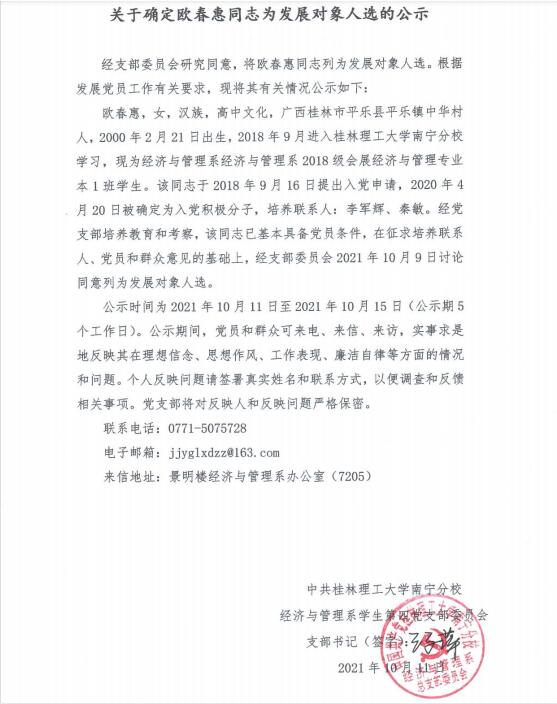 关于确定欧春惠同志为发展对象人选的公示