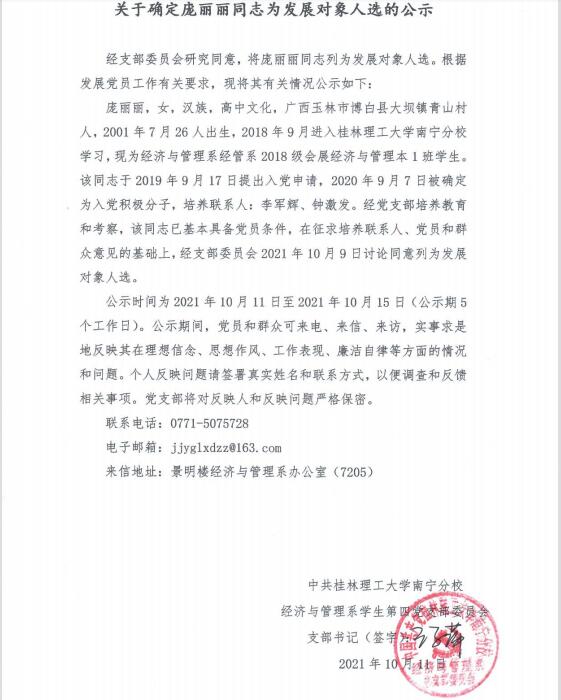 关于确定庞丽丽同志为发展对象人选的公示