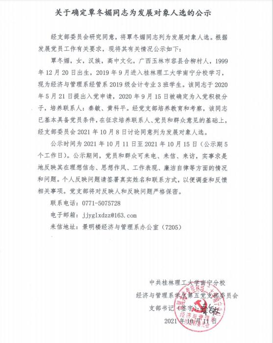 关于确定覃冬媚同志为发展对象人选的公示