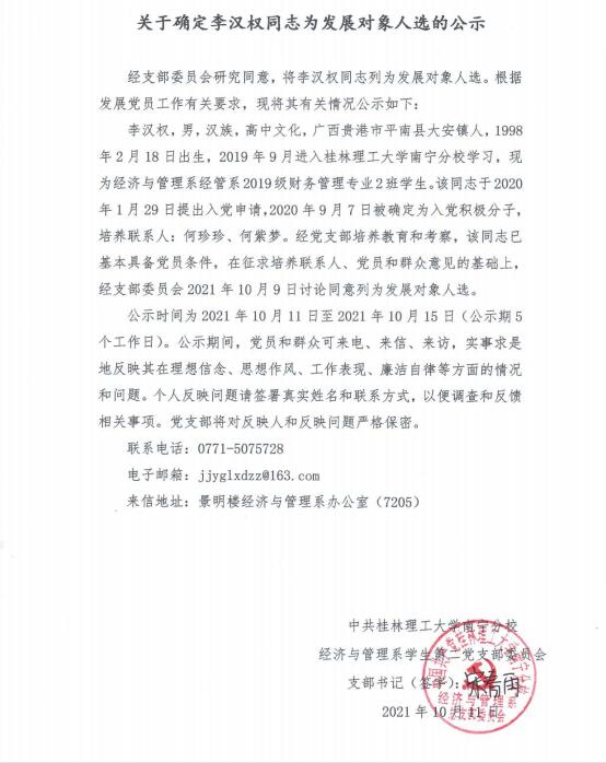 关于确定李汉权同志为发展对象人选的公示