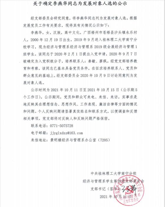 关于确定李燕华同志为发展对象人选的公示