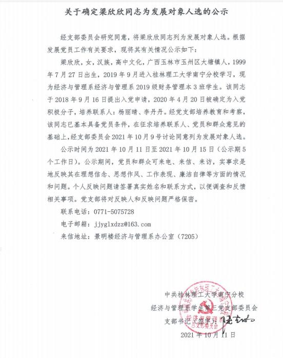 关于确定梁欣欣同志为发展对象人选的公示