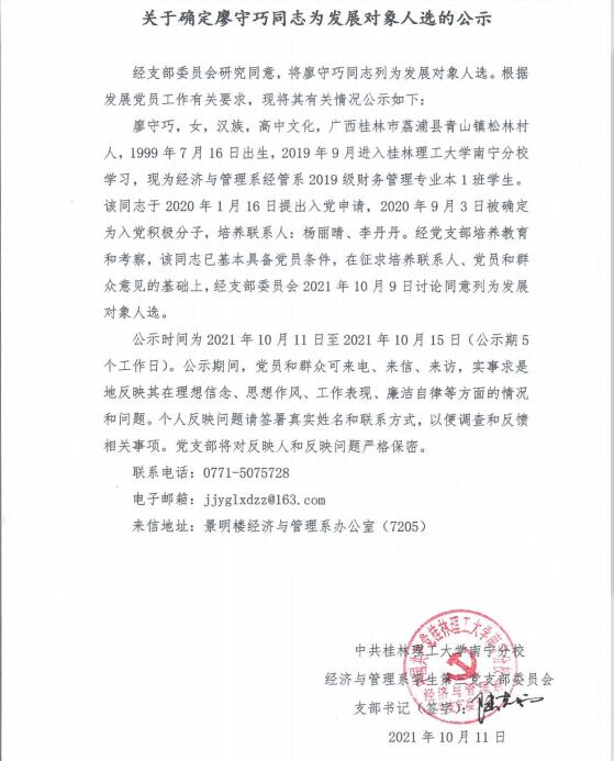 关于确定廖守巧同志为发展对象人选的公示