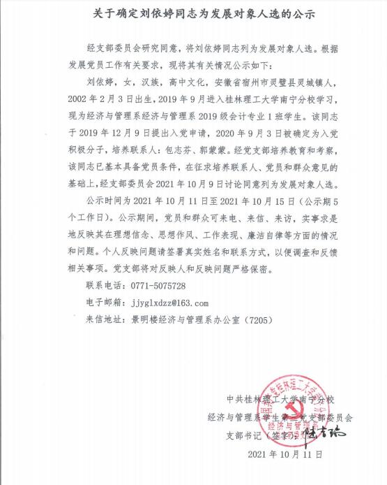关于确定刘依婷同志为发展对象人选的公示