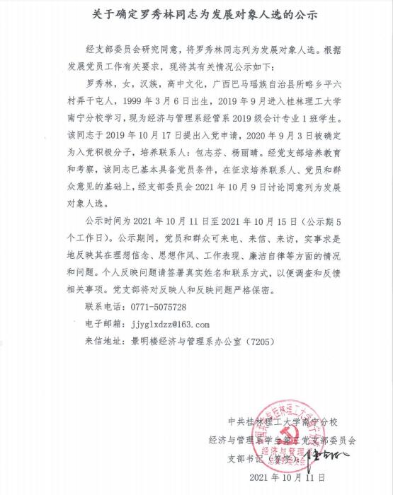 关于确定罗秀林同志为发展对象人选的公示
