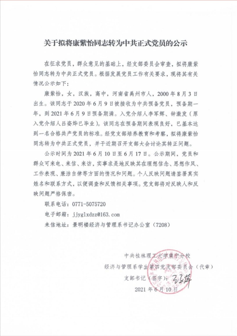 关于拟将康紫怡同志转为中共正式党员的公示
