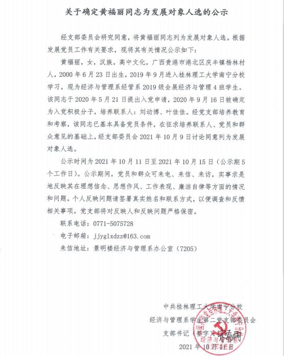 关于确定黄福丽同志为发展对象人选的公示