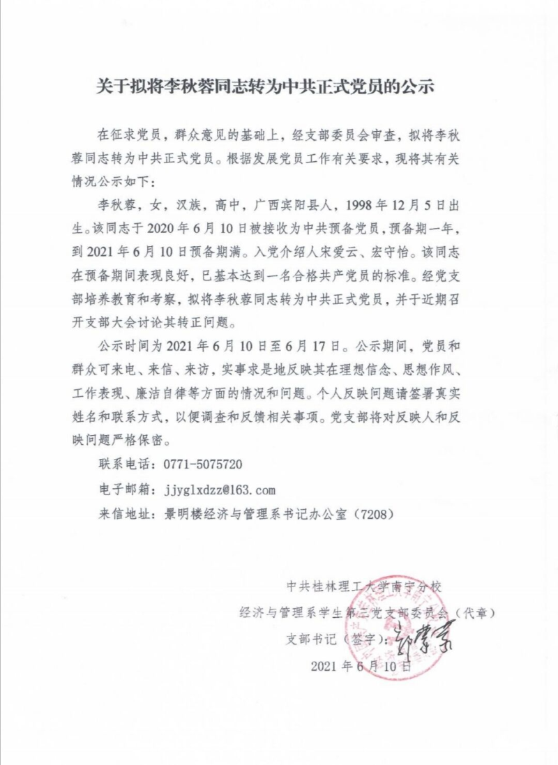 关于拟将李秋蓉同志转为中共正式党员的公示