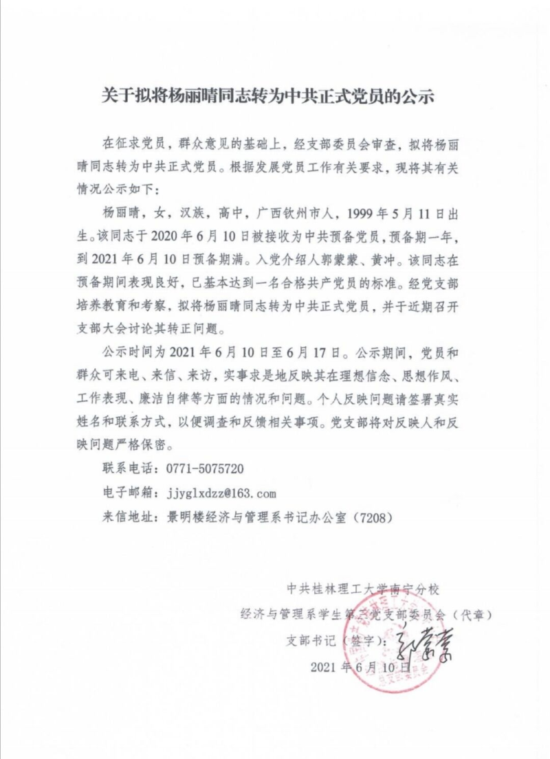 关于拟将杨丽晴同志转为中共正式党员的公示