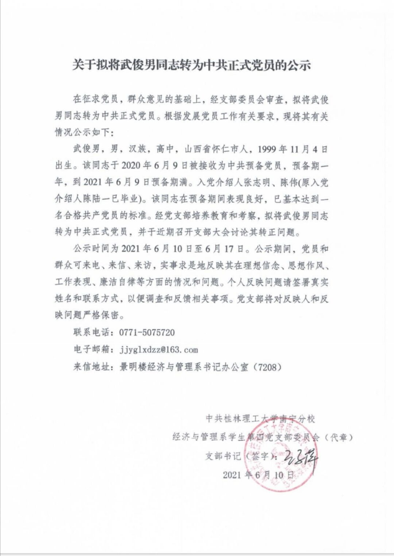 关于拟将武俊男同志转为中共正式党员的公示