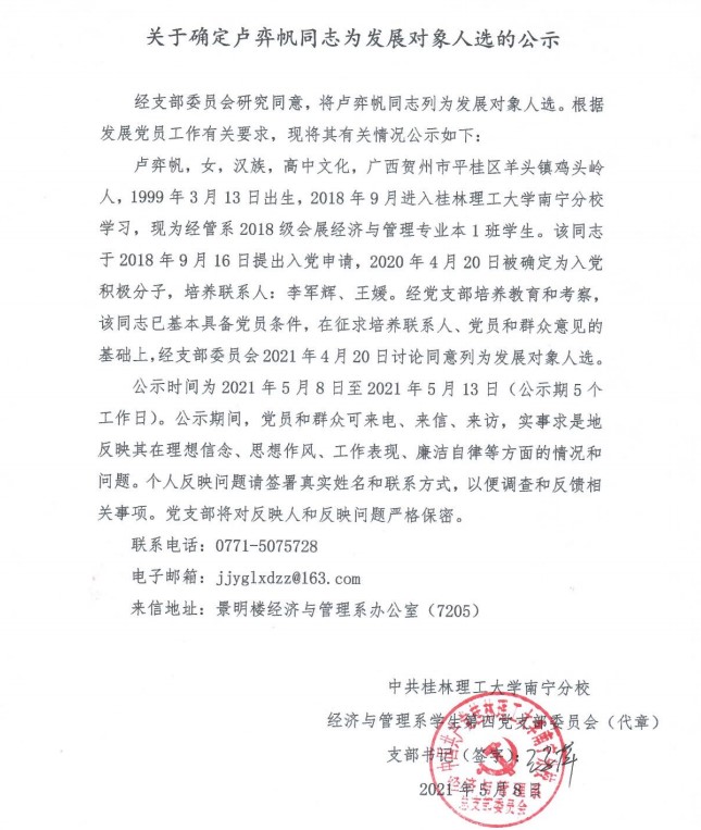 经济与管理系学生第四党支部关于确定卢弈帆同志为发展对象入选的公示