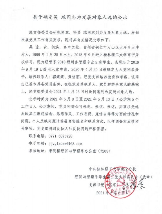 经济与管理系学生第三党支部关于确定吴琼同志为发展对象入选的公示