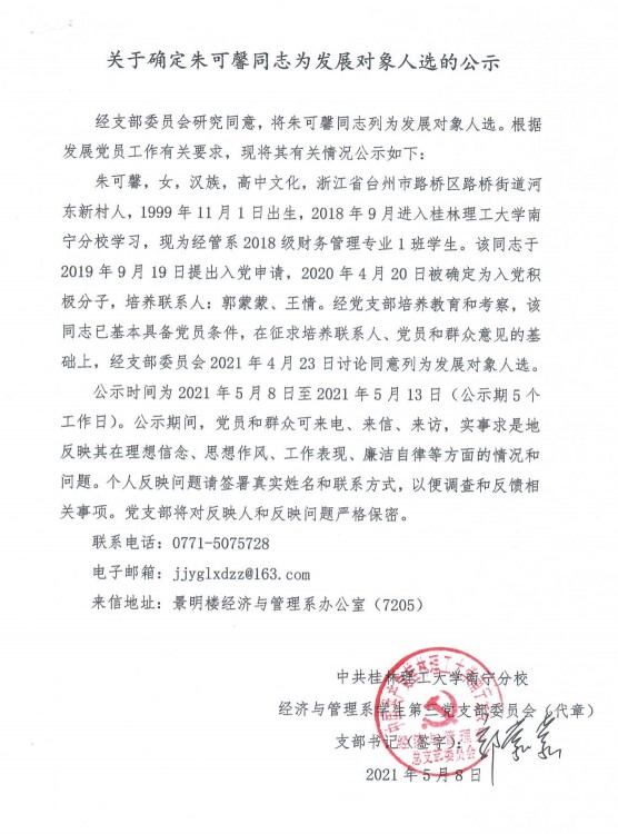 经济与管理系学生第三党支部关于确定朱可馨同志为发展对象入选的公示
