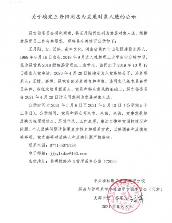 经济与管理系学生第四党支部关于确定王丹阳同志为发展对象入选的公示