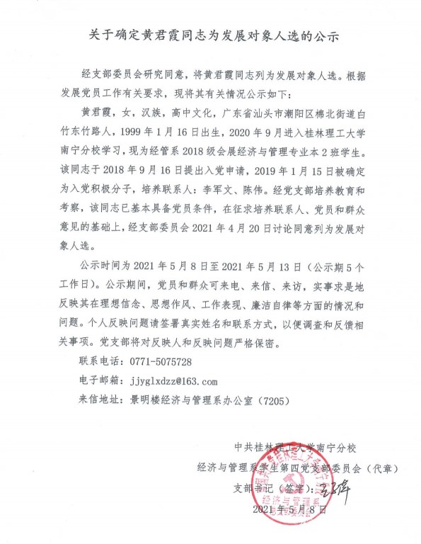 经济与管理系学生第三党支部关于确定黄君霞同志为发展对象入选的公示