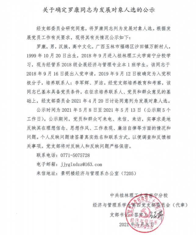 经济与管理系学生第四党支部关于确定罗康同志为发展对象入选的公示