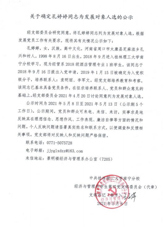 经济与管理系学生第四党支部关于确定孔婷婷同志为发展对象入选的公示