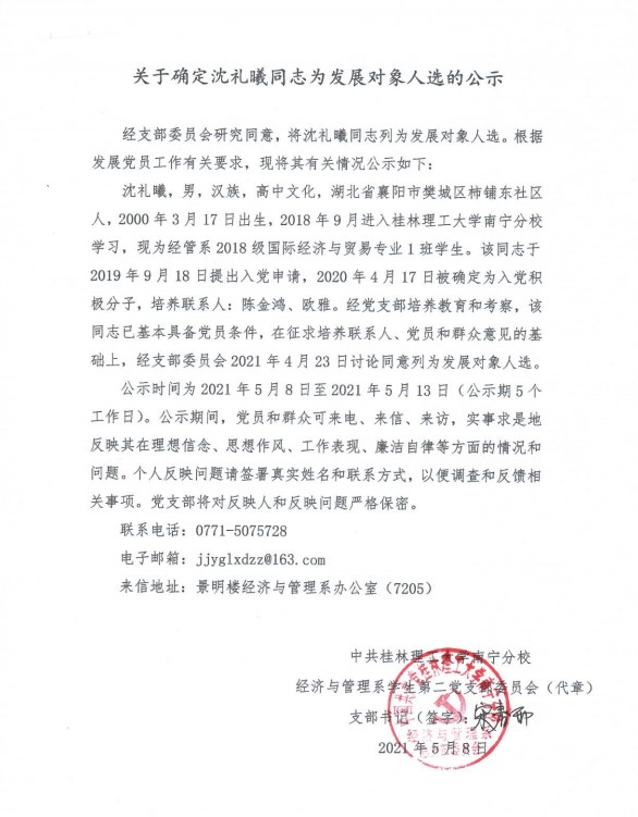 经济与管理系学生第二党支部关于确定沈礼曦同志为发展对象入选的公示