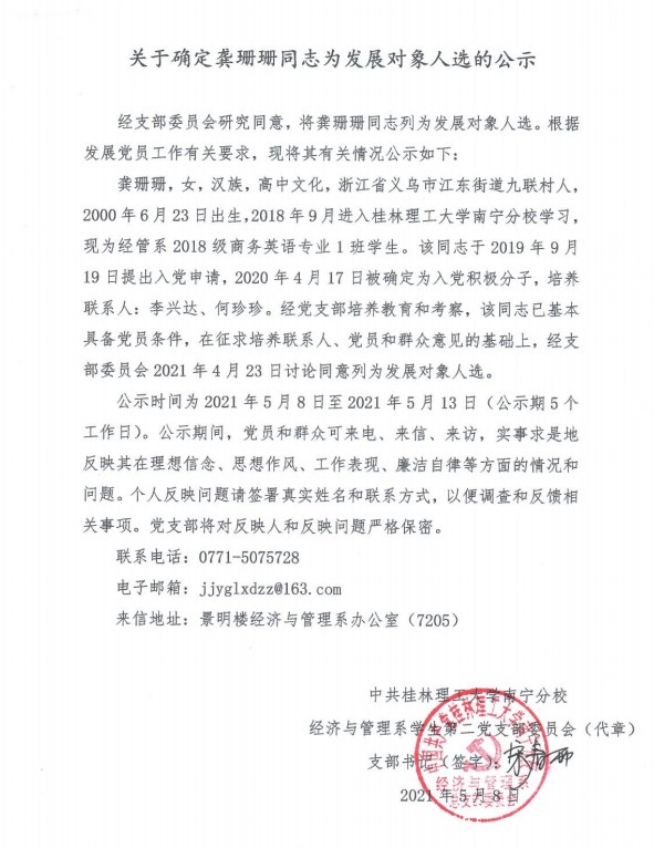 经济与管理系学生第二党支部关于确定龚珊珊同志为发展对象入选的公示