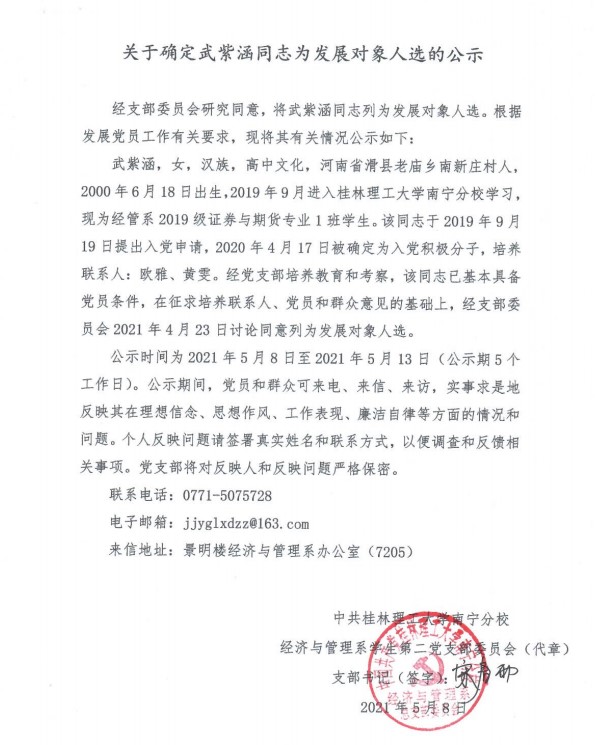 经济与管理系学生第二党支部关于确定武紫涵同志为发展对象入选的公示