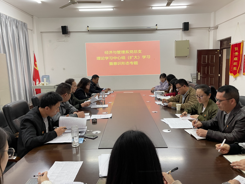 12月2日下午,经济与管理系在7210会议室召开党总支理论学习中心组(扩大)暨意识形态专题会议。系部领导班子、党总支委员、各支部书记、辅导员参加会议。会议由党总支书记张凯主持。
