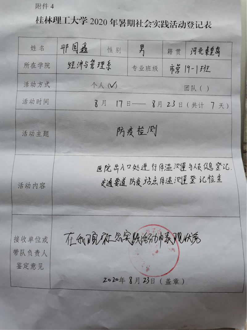 太阳集团2138关于2020年大学生暑假“三下乡”社会实践活动通知下达时,我校经济与管理系邢国鑫同学深知自己作为当代青年大学生,有责任也有义务为抗疫贡献自己的一份力量,因此他积极申请参加并在暑假期间踊跃投入于医院志愿活动中。在这次活动中,他负责的岗位主要是对进出人员进行信息登记,其中包括姓名、体温、居住地、手机号等。在这次实践活动中,邢国鑫同学认真负责,听从领导安排,并得到了领导的认可。