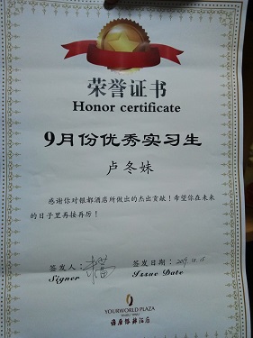 冬妹,经济与管理系酒店管理专业学生。2019年9月份进入银都酒店实习,获得了9月份优秀实习生的荣誉。