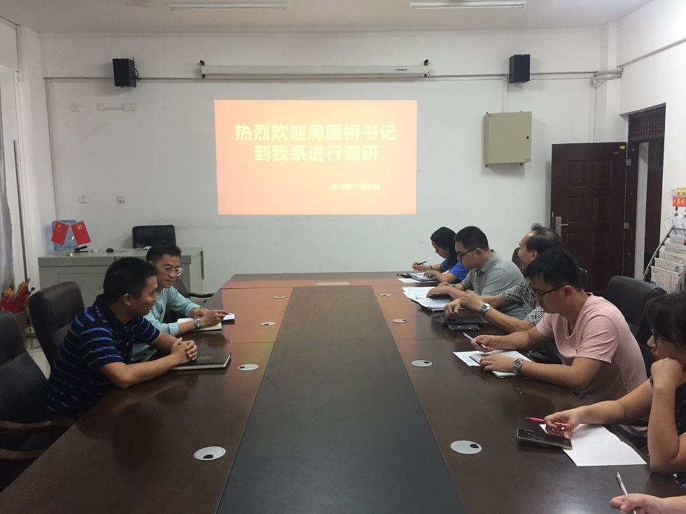 对系班子和教研室主任汇报的情况和问题,周书记认真做了记录,并对一些问题作了解答,同时肯定了该系教学、科研和党建的工作,也提出了几点要求:一是加强党的组织建设,凝聚发展的力量,利用主题教育提高师生党员的党性修养,并发挥好教师党员的带头作用,带好学生党支部;二是加强师资队伍建设,提升教学科研能力,在面对如今的广大教师、学生对于更好的学习、生活环境条件的需求矛盾时,要在发展过程中解决;三是要加强大学生思想政治教育,在学生工作中,要确保学生的安全和正确看待学生在思想等方面的问题;四是要抓好教育教学质量,面对财务资金紧张问题时,要重点分配,排序进行。