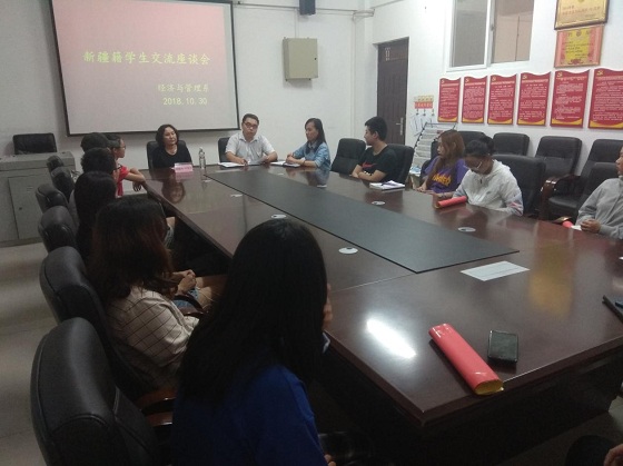 2018年10月30日,经济与管理系于景明楼210会议室组织召开新疆籍学生座谈交流会。学工部教师帕提玛•阿斯克、党总支副书记兼学工组组长陈曙钰、辅导员梁凤美出席会议,经管系全体新疆籍在校学生参加了座谈会。会议由党总支副书记兼学工组组长陈曙钰主持。