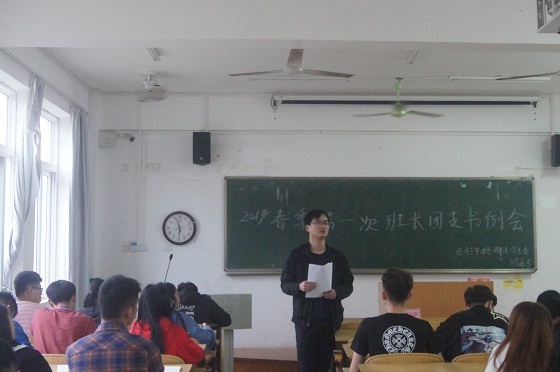 会议伊始,团总支书记范立添为级17、18的班长、团支书布置本学期工作及大致的活动内容。强调班长、团支书应及时通知所带班级参加补考的同学不要记错地点、时间错过补考。再次强调宿舍安全问题,要求大家注意保持宿舍卫生、禁止使用大功率电器、不要出现晚归、未归情况。随后,告诫全体班长、团支书从本学期开始将要开展月份优良班级评比并详细讲解了评定标准,要求各班团支书继续推进青年大学习,本学期将围绕青年大学习的内容开展相关的活动。此外,声明本月为学雷锋活动月,希望各位班长、团支书能够动员大家积极参与雷锋相关的活动。同时对各班申请公益活动不积极的现象提出批评,希望大家积极参与。