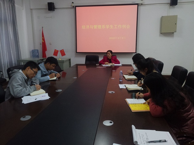 新学期,新征程,新气象。3月9日上午,经济与管理系在7210会议室召开学生工作例会,系党委书记梁勤主持,系辅导员陈曙钰、黄泽楷、卢智泉、潘显鹏、韦链、林靖、刘莹莹参加了此次会议。