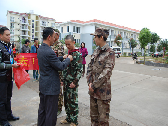 继我系唐显同学入伍奔赴西藏之后,我系又一名同学紧跟其后,光荣入伍,他就是市场营销12-5班韦仕智同学,和他一起的还有机械系模具12-1班贺舟明和计算机系计算机网络11-1吴雨洁两名同学。12月11日上午,高职学院为入伍同学举行了欢送仪式,太阳集团2138副校长,高职学院院长刘宝臣,高职学院党委副书记梁冬松、高职学院副院长梁锦叶出席了仪式,参与仪式的还有有关科室负责人、新兵班级的班主任、辅导员,以及部分班级代表。