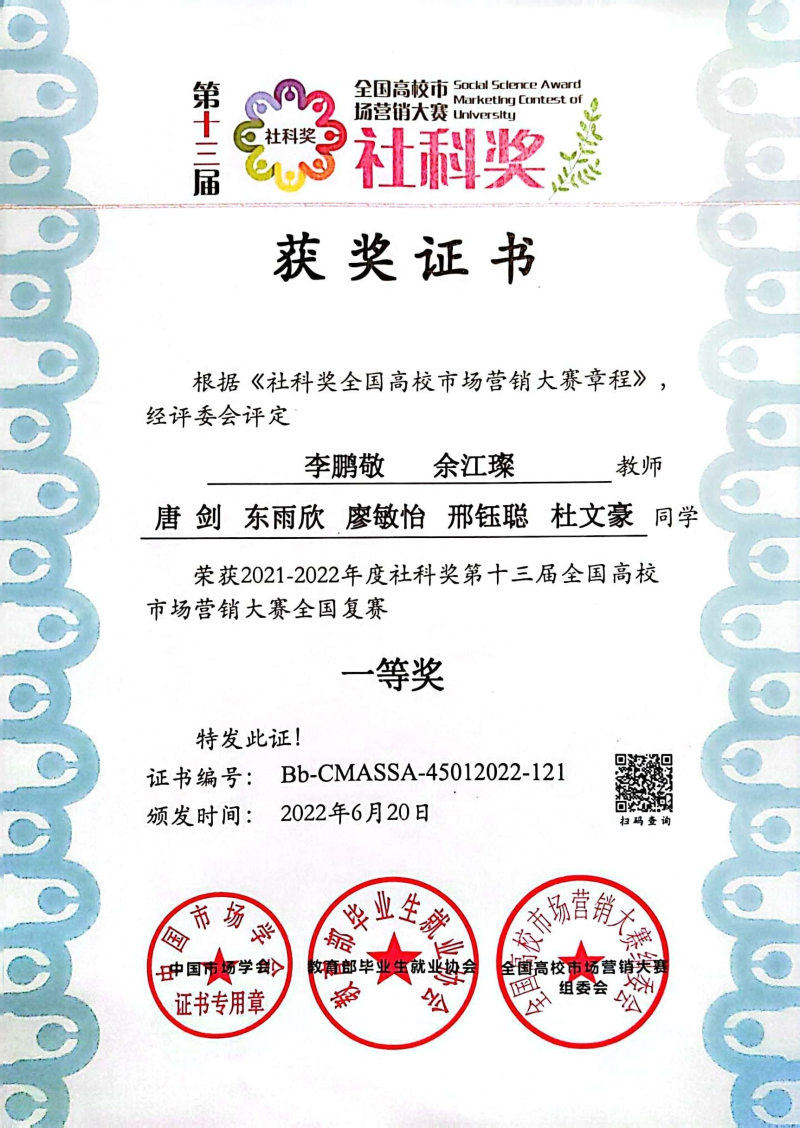 学生在第十三届全国高校市场营销大赛全国复赛喜获一等奖