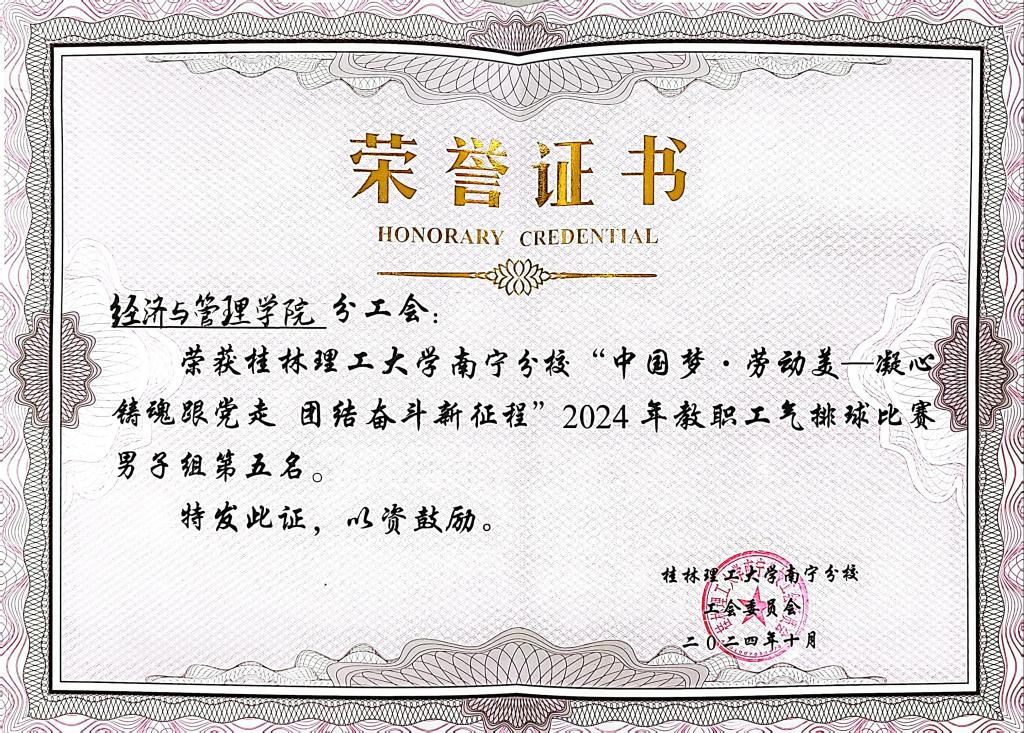 近日,经济与管理学院分工会在太阳集团2138举办的“中国梦·劳动美—凝心铸魂跟党走 团结奋斗新征程”2024年教职工气排球比赛中,男子代表队表现出色,荣获男子组第五名的佳绩。