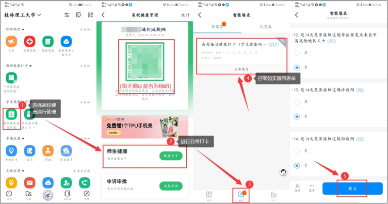 (四)每日健康打卡。每日健康打卡是学生向学校提交每天健康信息的渠道,提交内容关联“通行(返校)码”的颜色状态(绿、黄、红三个颜色,但必须先按照上述的步骤申领,否则仍是灰色)。绿码为正常状态,连续超过24小时不打卡将转为灰色。如不慎将健康打卡内容填写错误导致健康码变黄色或红色,可通过“通行(返校)码”下方的“申述审批”进行更正,提交审批。(审批人选择本系辅导员或邹霖敏老师)