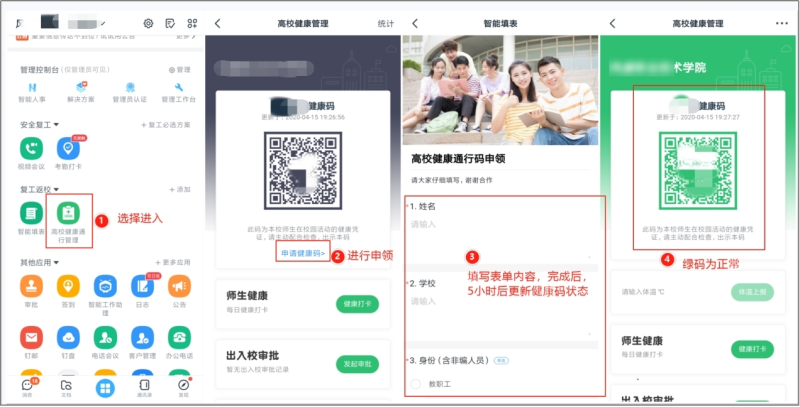 1.通行(返校)码:手机钉钉-->工作台(页面底部中间校标,下同)-->高校健康通行管理-->申请通行返校码(提交后5小时左右变色)。(见图1)