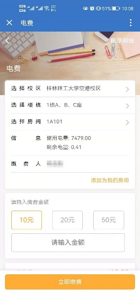 宿舍用电场景采用预付费模式,目前支持通过“企业微信—A-一卡通—电费”向宿舍电控缴费,付款方式支持“微信支付”及“一卡通”支付。缴费时根据界面提示,选择“校区、楼栋、房间”后,可显示目前房间已使用电量及剩余电量,如图所示:
